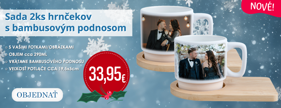 Sada dvoch hrnčekov s matným povrchom a s bambusovým podnosom s Vašou fotografiou/grafikou/obrázkom/textom.Veľkosť potlače: cca 19x5cm. Špecifikácia: Priemer: 85mm Výška: 83mm Objem: cca 290ml Typ potlače: sublimácia