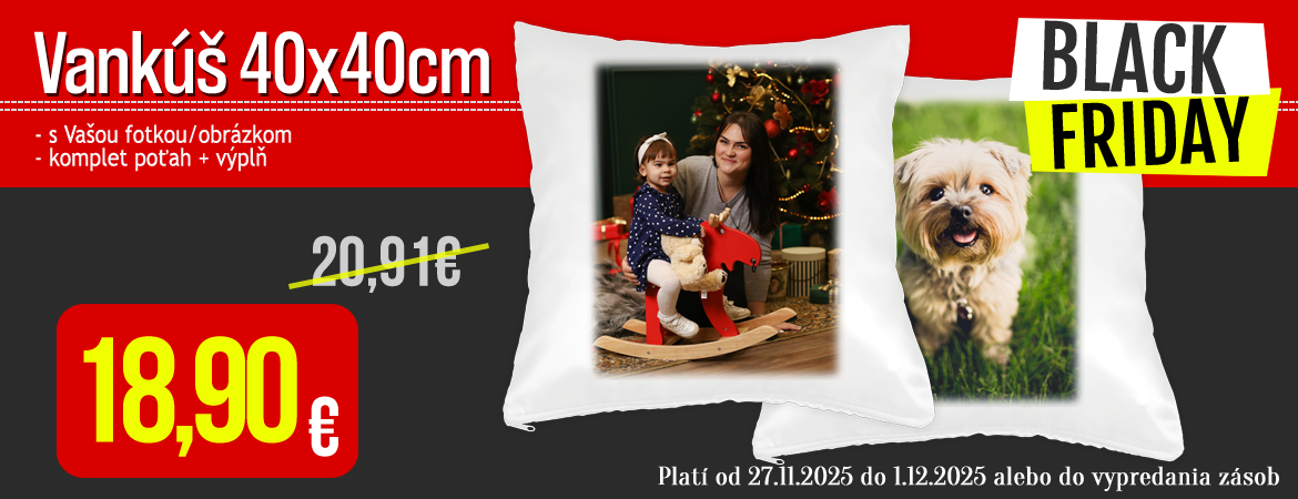 Vankúš 40x40cm s vlastnou fotkou/obrázkom a nápisom.!! Pri potlači na obe strany vankúša nezabudnite zvoliť možnosť "Obojstranná potlač"!! Špecifikácia: Veľkosť vankúša: 40x40cm Materiál: 100% polyester (satén) - poťah, 100% bavlna/antialergické vlákno (výplň) Typ potlače: sublimácia Max. veľkosť potlače: 28x35cm