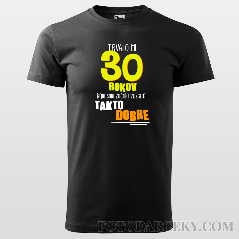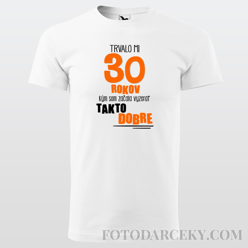 Bavlnené tričko s potlačou "Trvalo mi 30 rokov aby som vyzerala takto dobre". Príjemný bavlnený materiál so silikónovou úpravou. Je možné si vybrať pánsky/unisex alebo dámsky strih trička.