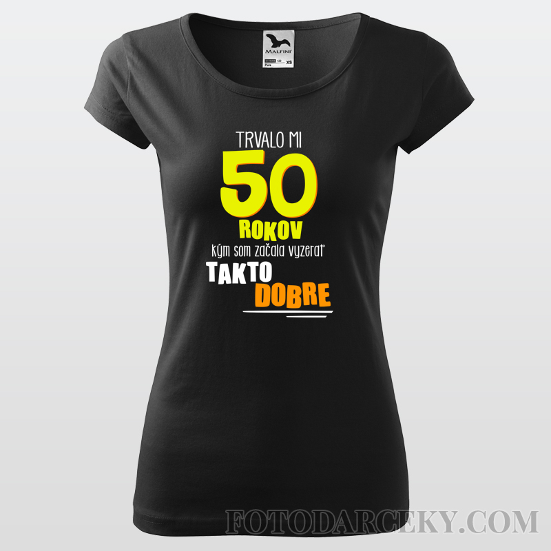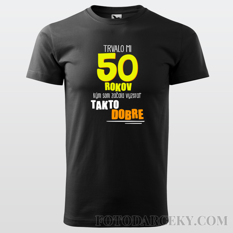 Bavlnené tričko s potlačou "Trvalo mi 50 rokov aby som vyzerala takto dobre". Príjemný bavlnený materiál so silikónovou úpravou. Je možné si vybrať pánsky/unisex alebo dámsky strih trička.