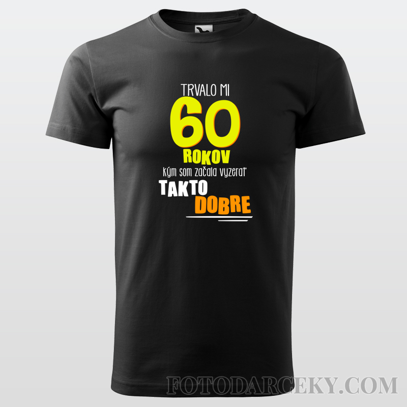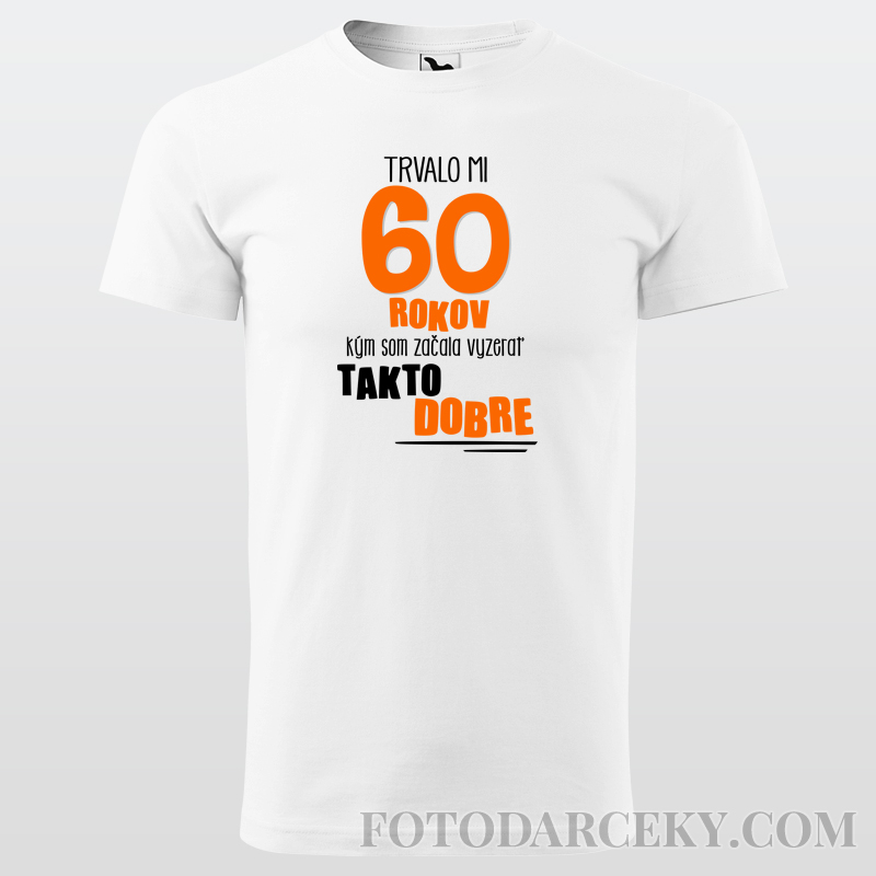 Bavlnené tričko s potlačou "Trvalo mi 60 rokov aby som vyzerala takto dobre". Príjemný bavlnený materiál so silikónovou úpravou. Je možné si vybrať pánsky/unisex alebo dámsky strih trička.