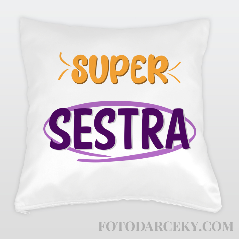 Saténový vankúš potlačený nápisom "Super sestra". Potlačená je saténová návliečka. Súčasťou je aj výplň.
