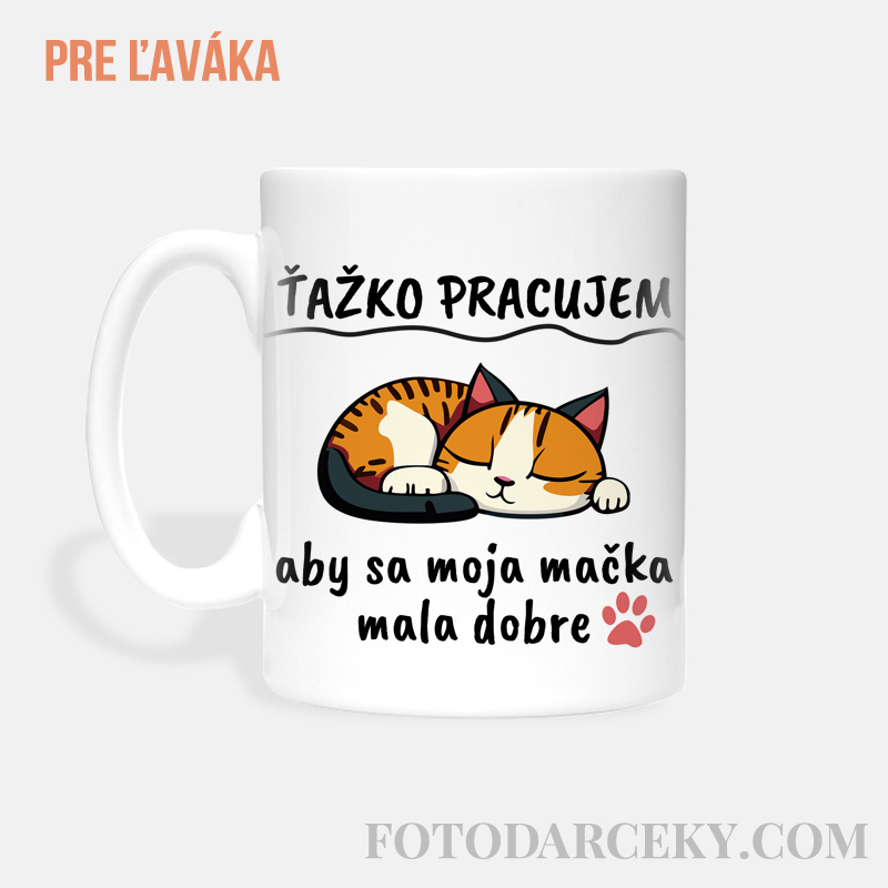 Biely keramický hrnček s nápisom "Ťažko pracujem, aby sa moja mačka mala dobre". V cene hrnčeka je aj krabička!!!