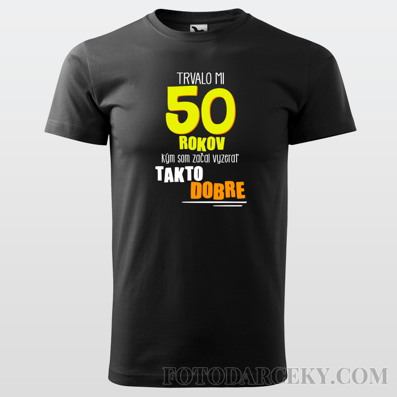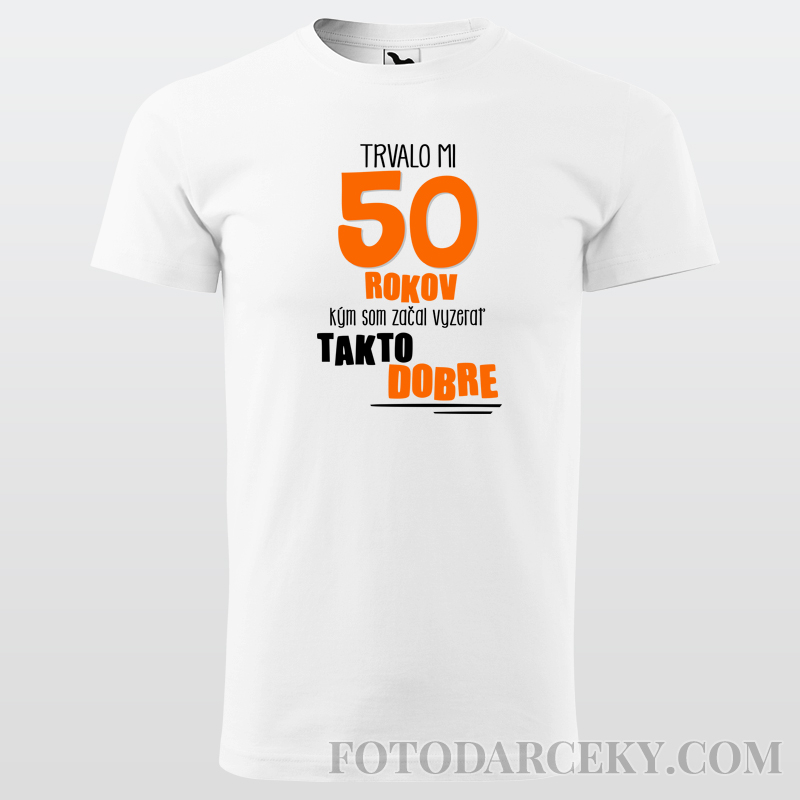Pánske bavlnené tričko s potlačou "Trvalo mi 50 rokov aby som vyzeral takto dobre". Ak si želáte iný vek, je možné ho napísať do kolónky prispôsobenie produktu - iný vek, následne uložiť a tričko vložiť do košíka.